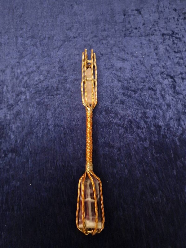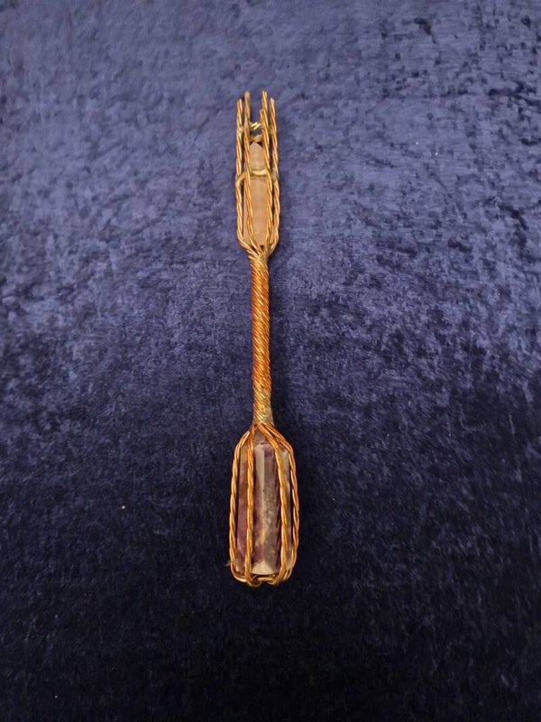 .Koppartråd som är trippelspunnen. Agat/ametist i botten och en rosenkvarts i toppen